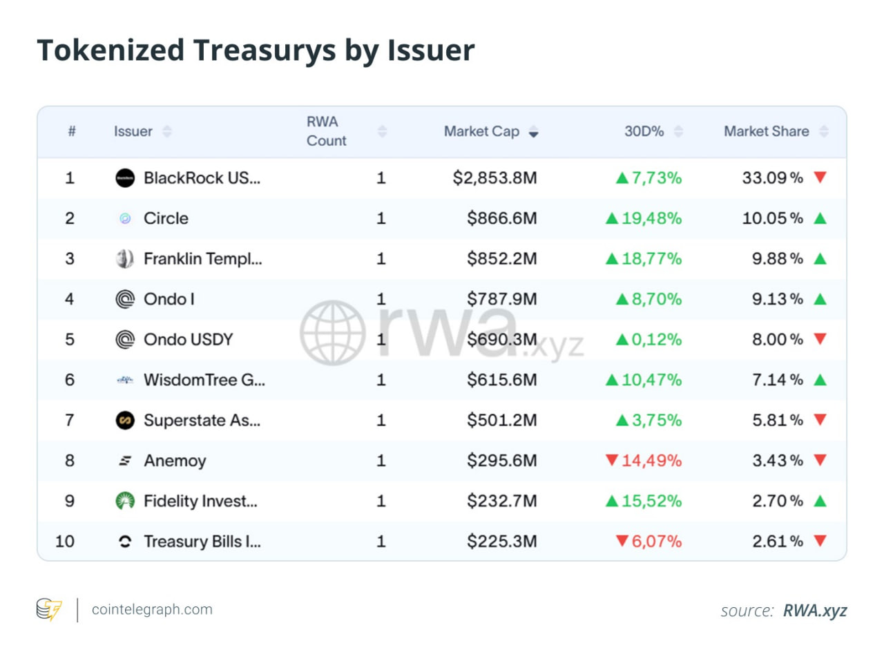 Рынок пока сосредоточен в руках нескольких крупных игроков. BlackRock BUIDL занимает около 33% рынка, а доли Franklin Templeton BENJI, Ondo OUSG и Circle USYC составляют по 9–10%. Однако структура рынка постепенно диверсифицируется: появляются новые управляющие, а ликвидность распределяется между несколькими регулируемыми фондами.