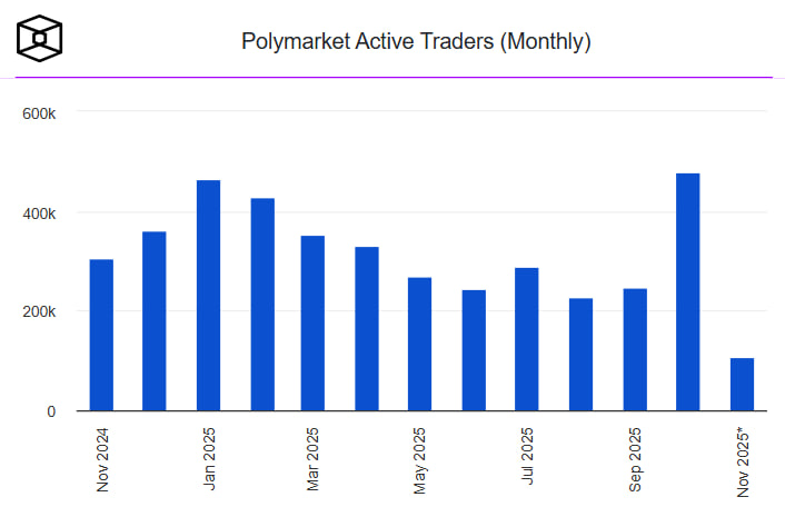 По данным The Block, число активных трейдеров на Polymarket достигло исторического максимума — 477 850 человек. Это выше предыдущего рекорда в 462,6 тыс., установленного в январе, и почти вдвое больше, чем в августе, когда показатель опускался до 227 тыс.