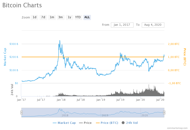 Рыночная капитализация биткоина сейчас находится на годовом максимуме. После недавнего обострения волатильности на крипторынке стоимость всех BTC достигла $208,768 млрд.