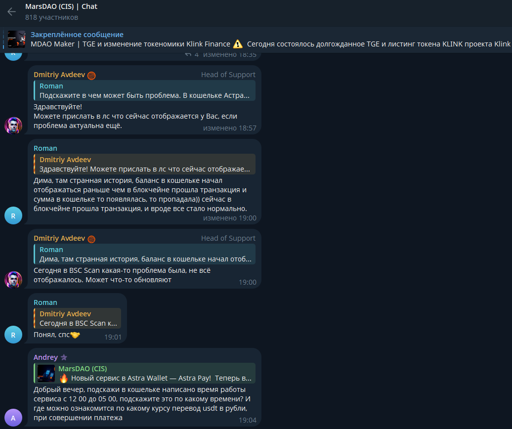 Мы не нашли полноценных отзывов о Astra Wallet в интернете. Однако у проекта есть чат в Telegram, где клиенты свободно общаются и задают вопросы администрации. Мошеннические проекты вряд ли бы подобное допустили, поэтому базовое доверие к сервису имеется.