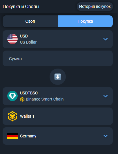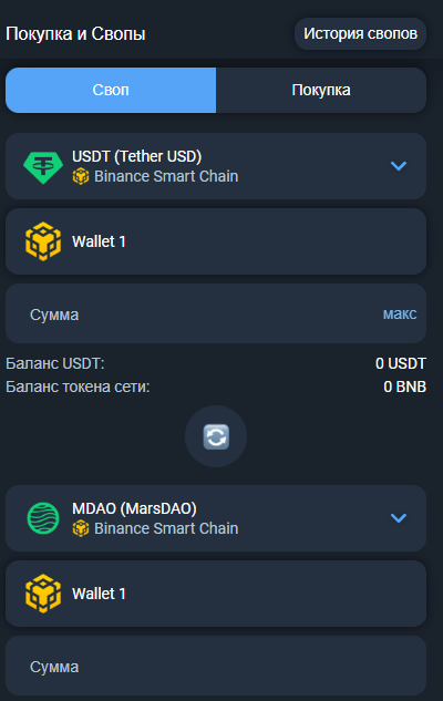 Для простого обмена коинов переходим в «Покупка и Свопы», после чего можно совершать транзакцию с любыми доступными монетами.