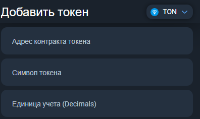 Пользователь может добавить любой токен, работающий на одной из перечисленных сетей. Для этого в разделе «Кошелек» нажимаем на соответствующую кнопку и вводим данные монеты: адрес контракта, символ, выбираем единицу учета.