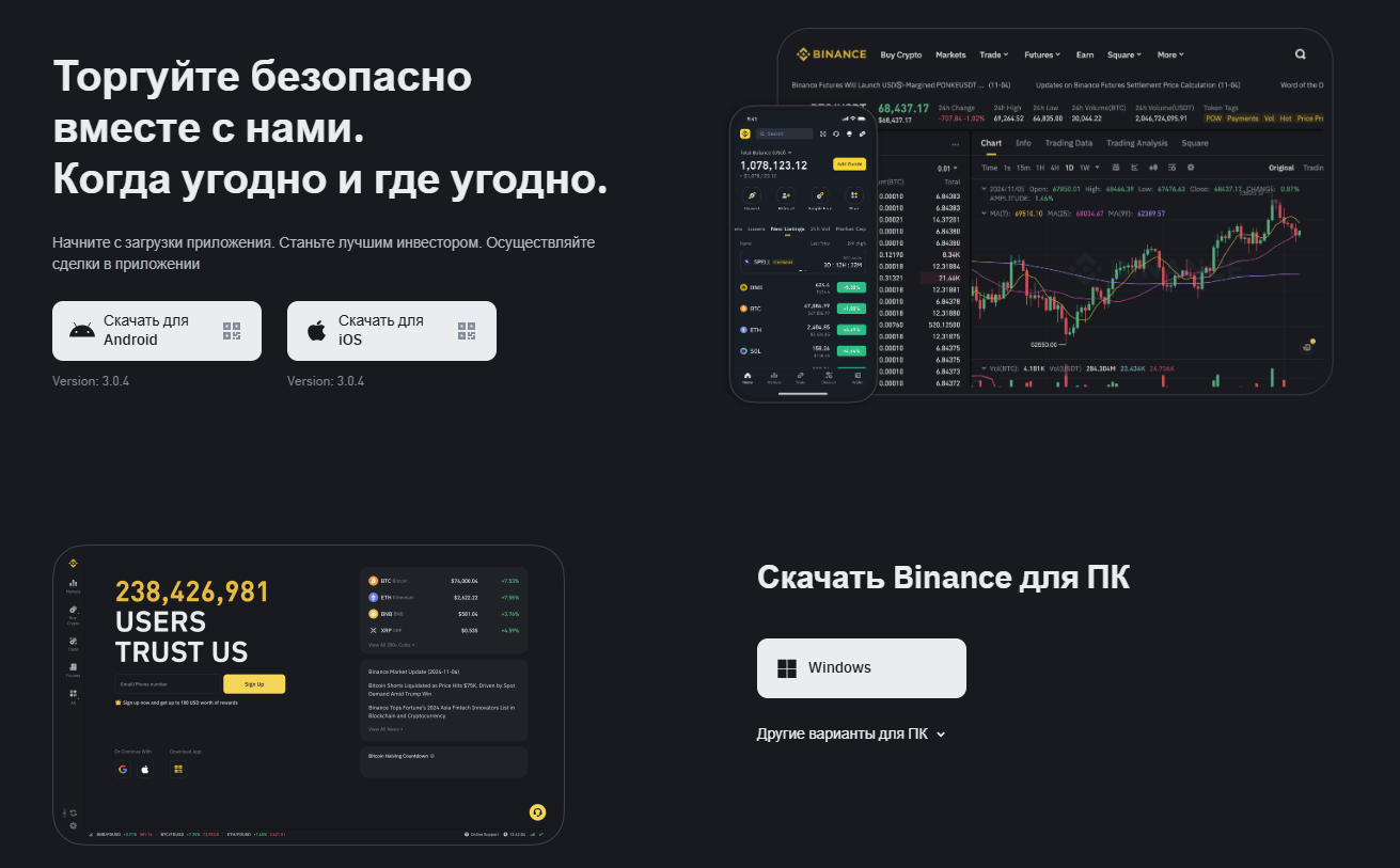 При скачивании программы на смартфоны и айфоны установка проходит в автоматическом режиме. Клиентам доступна возможность использовать расширение электронного кошелька Binance Wallet для хранения крипты в «Бинансе» для браузера, пользоваться веб-версией или скачать десктопное приложение.