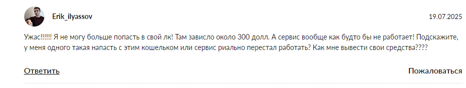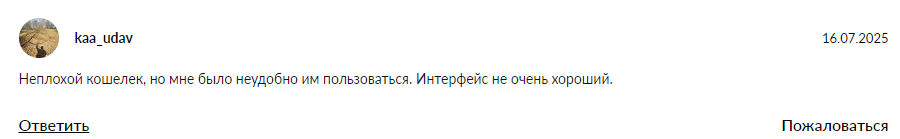 В отрицательном отзыве один из инвесторов говорит, что кошелек неудобный. Ему не нравится интерфейс сервиса.