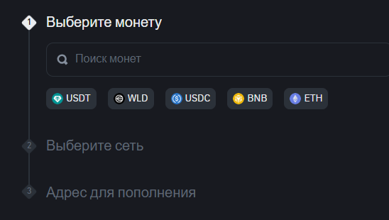Ему будет предложено два варианта выполнения процедуры при наличии криптоактивов и без них. Если пользователь выберет первый способ, чтобы пополнить кошелек «Бинанс Валет», то потребуется выбрать тикер монет из предложенных, указать сеть и скопировать адрес. Сохраненный номер криптокошелька нужно вставить в специальное поле на другом устройстве и перевести деньги.