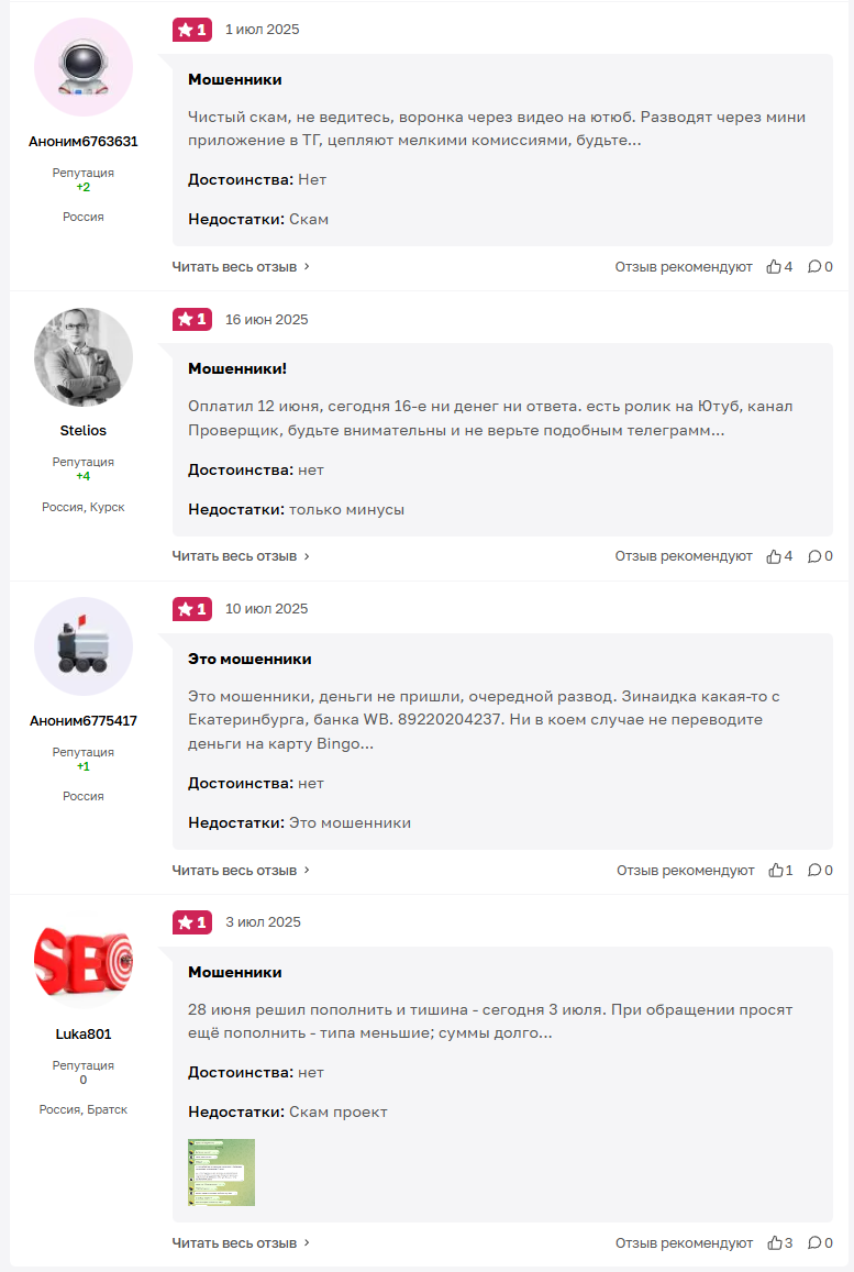 В сети можно найти много отзывов недовольных клиентов. В них единогласно говорят о том, что информацию о кошельке обманутые клиенты получили на Ютуб. В результате им предложили перевести деньги на счета в разных банках непонятных пользователей. Вероятнее всего, это были просто дропперы.