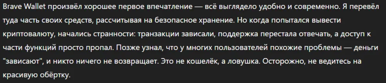 В отрицательных отзывах о Brave Wallet читается тревога и разочарование пользователей. Владелец криптокошелька утверждает, что перевел деньги на платформу, но потом транзакции стали сбрасываться, скорость переводов снизилась, деньги не пришли на карту.