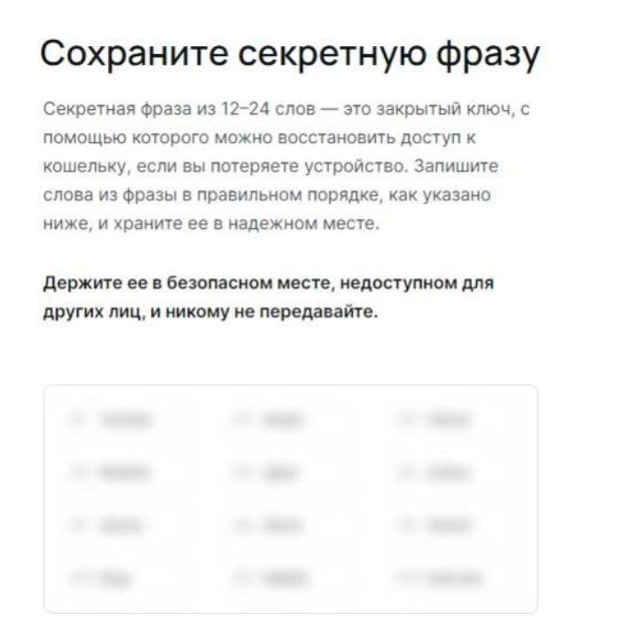 - Создаете пароль и прописываете его в специальное поле, затем генерируете секретную сид-фразу из 12 или 24 слов. Сохраняете ее на отдельном листе бумаги, чтобы не забыть.
