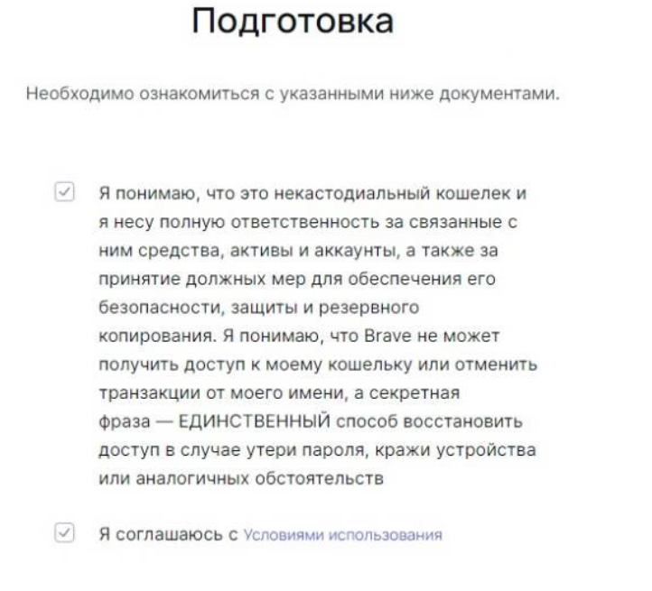 - Проставляете галочки на каждом пункте BraveWallet, которые возникают на экране.