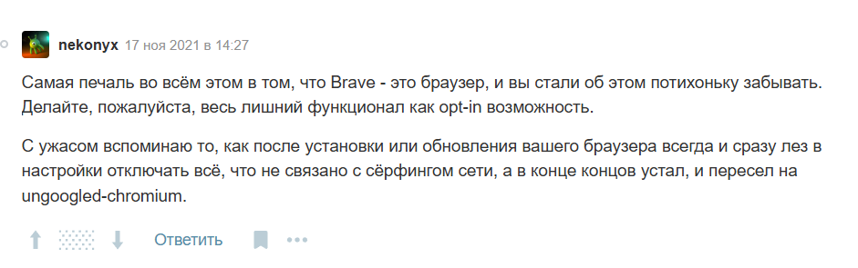 Один из клиентов утверждает, что система безопасности Brave отключает серфинг в сети по умолчанию. Ему это надоело и он перешел на другой кошелек.