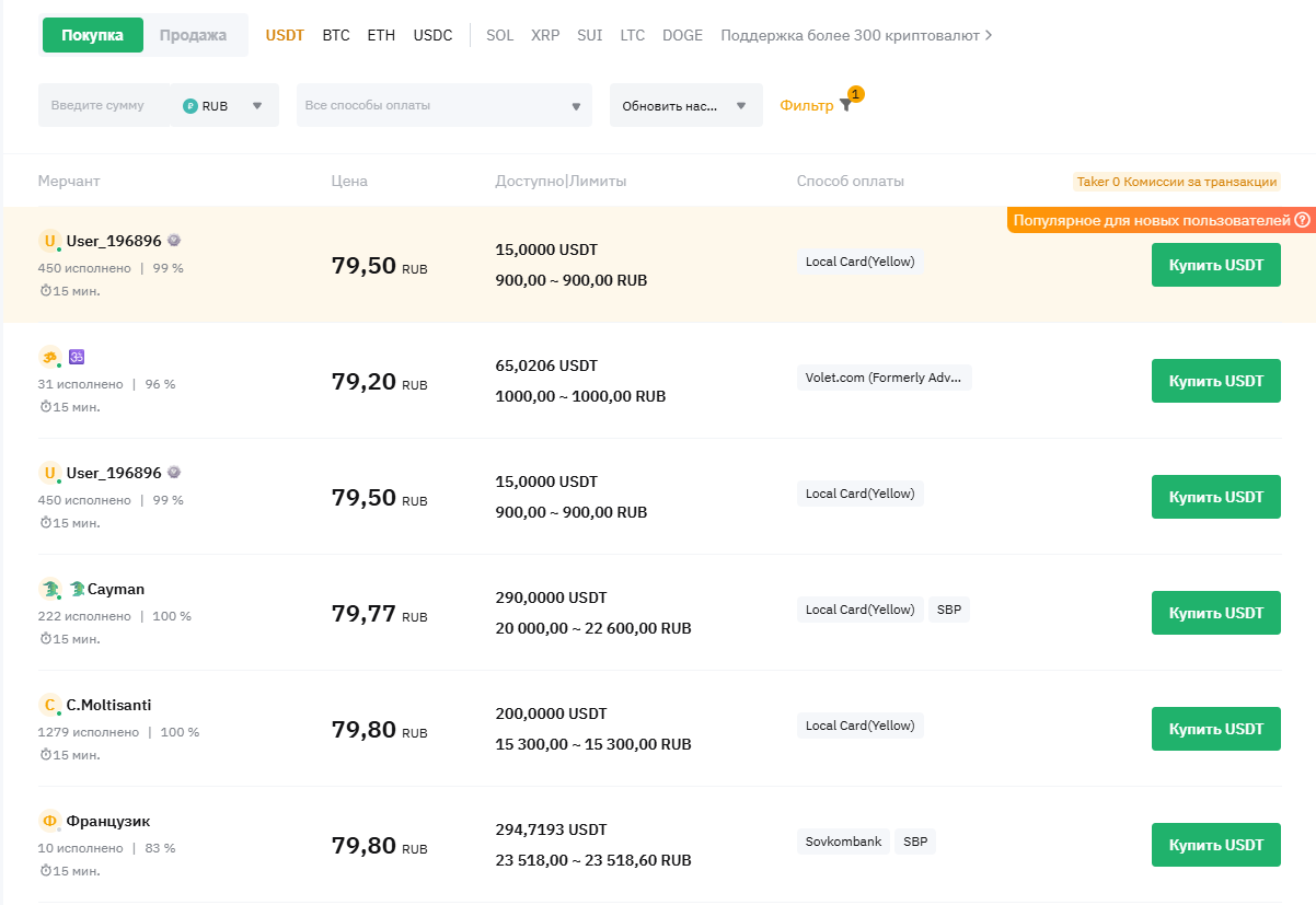 В отличие от многих других площадок, на «Байбит Волет» можно использовать и рубли, но только через P2P-торговлю. В этом разделе выбираем необходимую крипту и сверху указываем RUB. Далее ищем надежного продавца с высоким рейтингом и подходящим способом оплаты: доступны различные банки, перевод по СБП и несколько других вариантов.