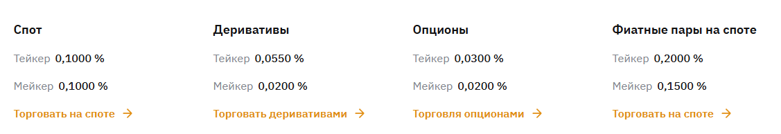 Прочая торговля к Bybit Wallet практически не имеет отношения, но ниже мы все же оставим таблицу с комиссионными удержаниями на спотовом, фьючерсном и опционном рынках: