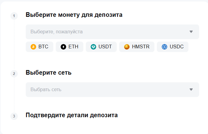 - Выбираем одну из 600+ монет и указываем сеть.