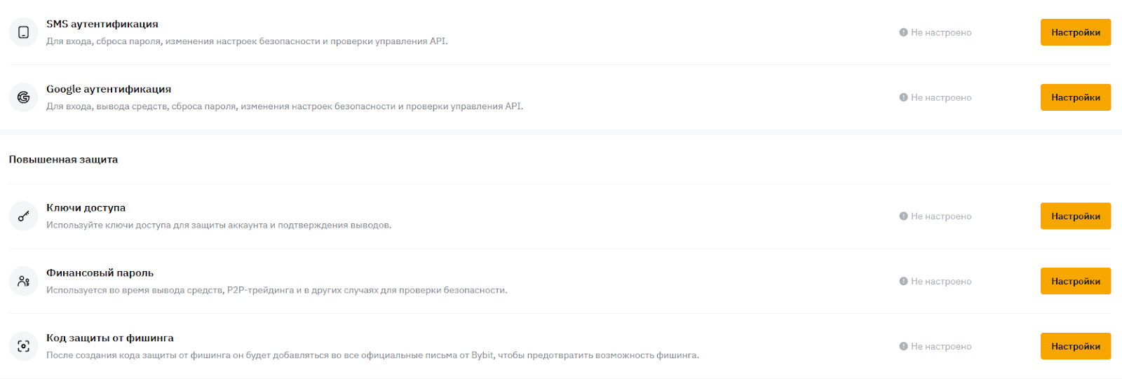 Способов защитить аккаунт кошелька «Байбит Валет» немало, самый базовый из них — двухфакторная аутентификация по SMS и через Google Authenticator. Также рекомендуется использовать ключи доступа и финансовый пароль, который будет запрашиваться при каждой транзакции. Все эти функции отображены в разделе «Безопасность».