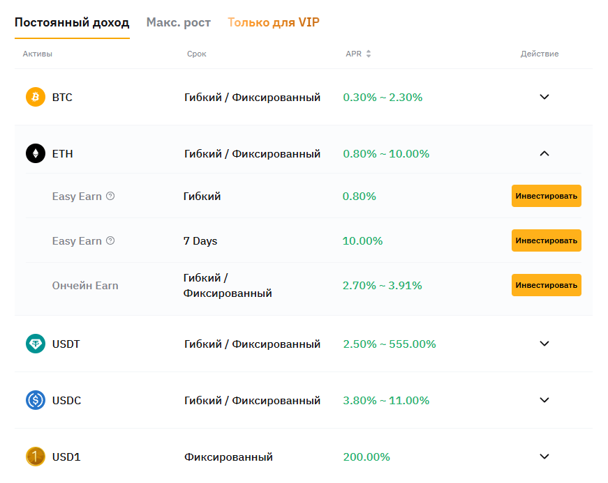 Вкладка Earn в разделе «Банкинг» открывает варианты пассивного заработка на вкладах в разную крипту. Сам процесс здесь не описан, однако пользователь может рассчитывать, например, заработать до 10% при 7-дневной инвестиции в ETH. Ознакомиться с другими предложениями можно прямо в программе, кликая на каждую из монет.