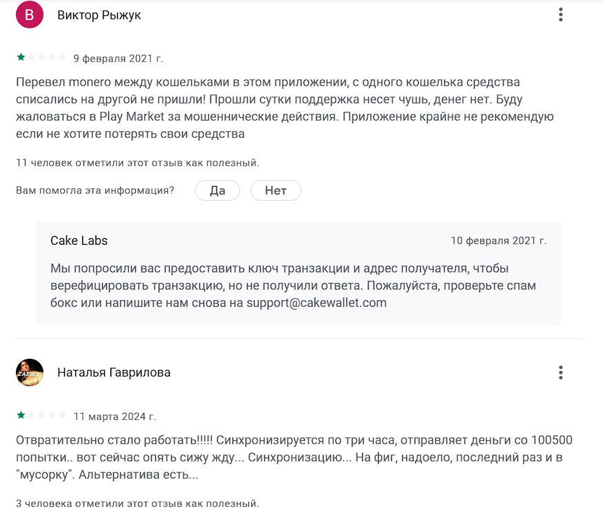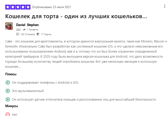 В интернете отзывы о cakewallet com неоднозначные. Большая часть пользователей ставят высокие оценки. Они считают приложение удобным, хвалят высокий уровень безопасности и скорость транзакций. Трейдерам нравится возможность переводить средства внутри приложения между своими кошельками.