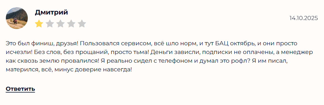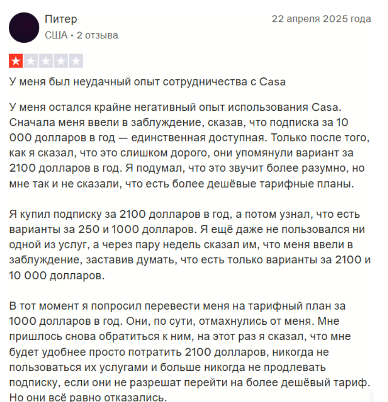 В другом негативном отзыве о Casa клиент пишет, что сначала все шло хорошо, но потом его аккаунт оказался заблокированным. Финансы остались в зависшем состоянии и подписки не оплачены. Пользователь решил больше не пользоваться этим сервисом.