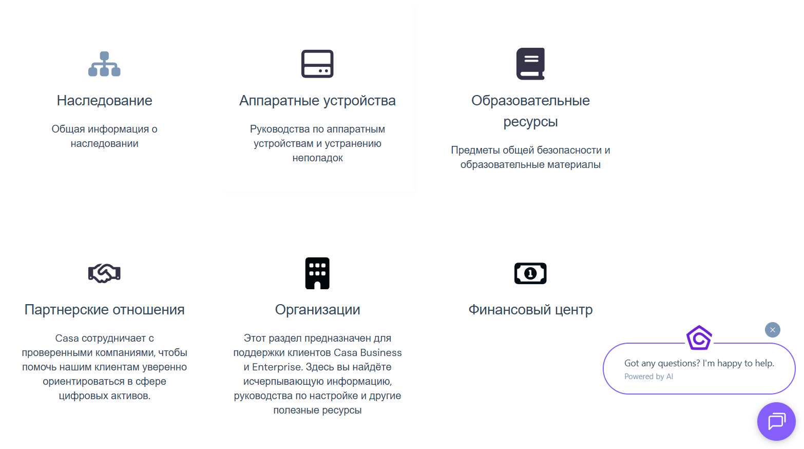 В разделе «Поддержка» расположены популярные вопросы и ответы на них. Ничего не сказано про электронные адреса и номера телефонов службы поддержки Casa для решения проблем с вводом или выводом токенов, входом в личный аккаунт.