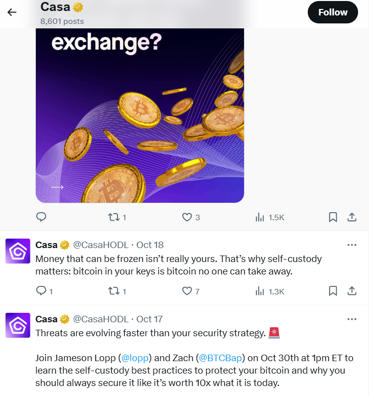 Если канал в Инстаграме не так интересен пользователям, то на октябрь 2025 года на профиль X с названием CasaHodl подписано 48 000 человек. Посты публикуются каждый день, просматривает их 3% аудитории, два-три пользователя оставляют комментарии и лайки.