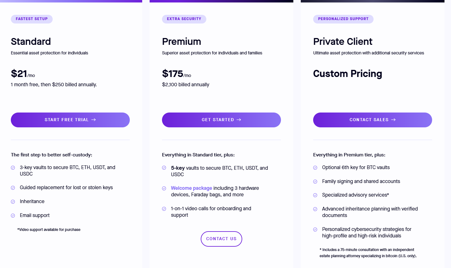 - Premium – премиальный тарифный план с ценой $175 в год. Пользователю будет дано пять секретных ключей для доступа к кошельку на случай потери одного из них. Как и в первом тарифе, один код хранится на сервере компании Casa.