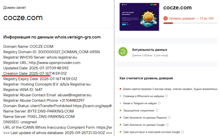 Простейшая проверка сайта на специализированном сервисе показывает, что домен был зарегистрирован 16 июля 2025 года, то есть он функционирует чуть больше 2 месяцев. Уровень доверия — 13 из 100 баллов по версии pr-cy ru, что не соответствует информации о большом опыте работы.