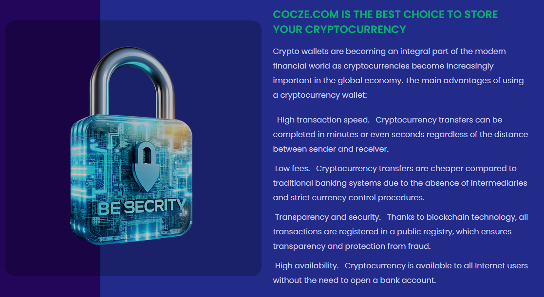 Проект Cocze позиционирует себя как инновационный сервис, а не просто кошелек для операций с криптовалютами. Его создатели называют себя лидерами в сфере хранения данных и защиты активов. Выясним, можно ли доверить свои финансы этой платформе без риска потерять их навсегда.