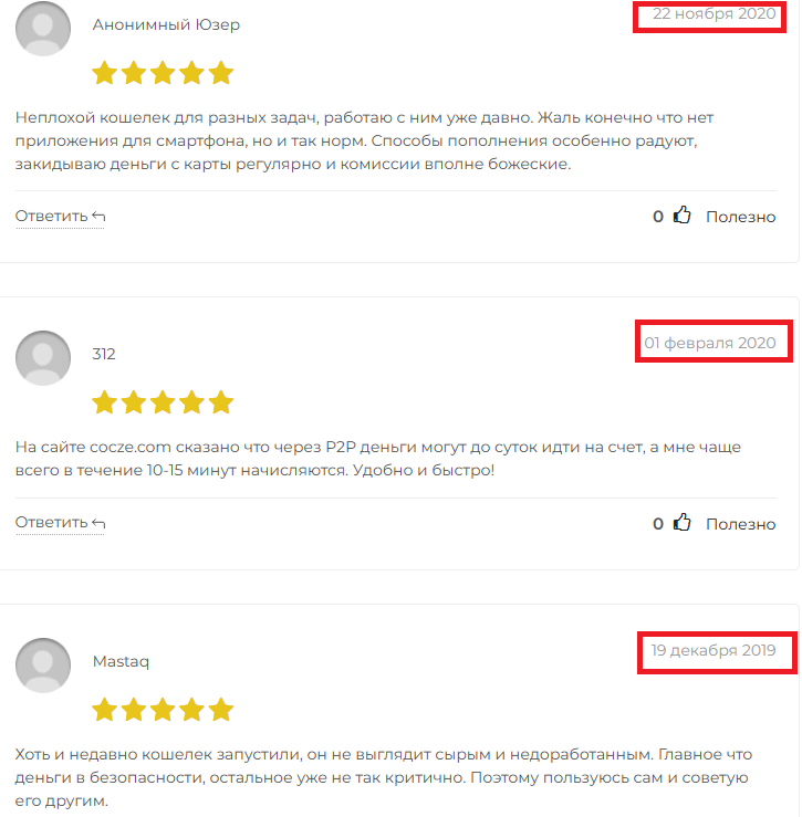 В интернете мнения клиентов об этом ресурсе противоречивы. Есть несколько хвалебных и нейтральных отзывов, написанных как по шаблону в то время, когда кошелька еще не существовало — в 2019–2020 годах. Главная мысль: кошелек запущен недавно, но хорошо работает, финансы в сохранности, деньги приходят быстро и легко выводятся. Доверять таким отзывам не стоит, потому что налицо подмена дат.