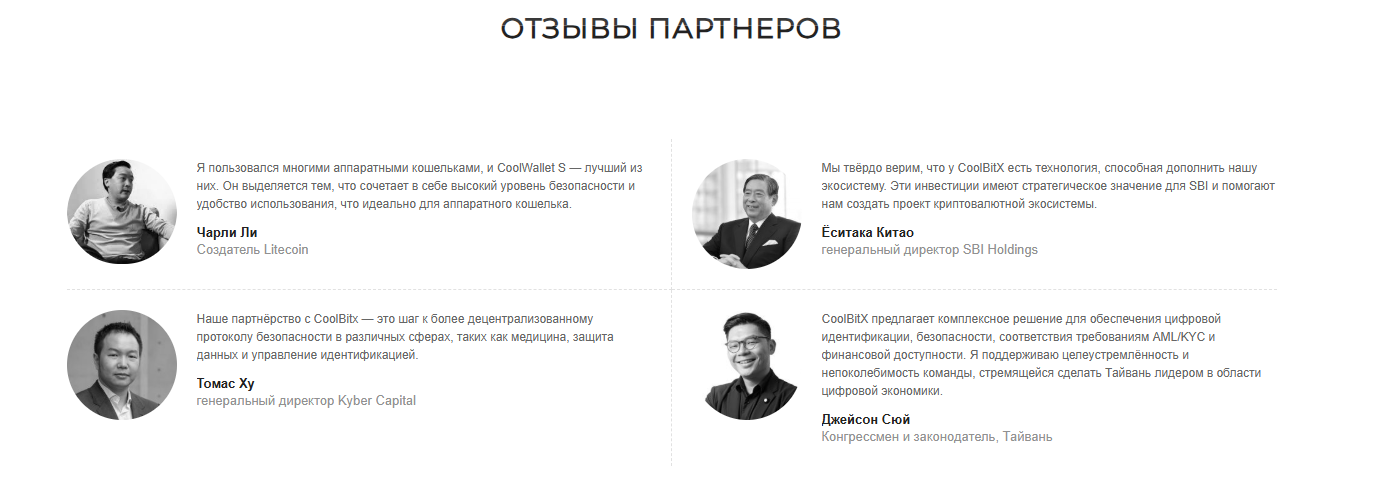 Основатели криптокошелька ведут сайт CoolWallet io, на котором выкладывают последние новости. Главная страница локализована под англоязычные страны, русский перевод отсутствует. На сайте можно найти информацию с отзывами от партнеров организации: