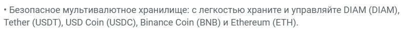 В описании проекта идет речь лишь о поддержке нескольких основных монет, упоминаний других мы не нашли. Трейдер может управлять криптовалютами DIAM, USDT, USDC, BNB и ETH. Наиболее востребованных и популярных, в том числе BTC, SOL здесь нет.