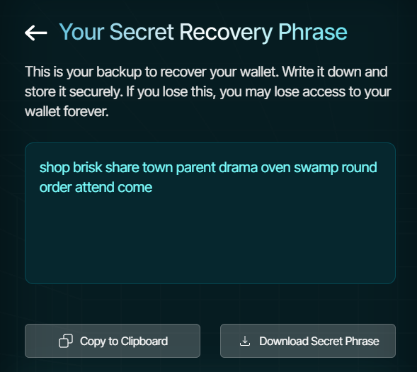 Пользователю также понадобится сид-фраза, которая появится на экране при регистрации. Пользователю необходимо куда-то выписать себе эти слова, т.к. далее будет тест с расстановкой их в первоначальном порядке.