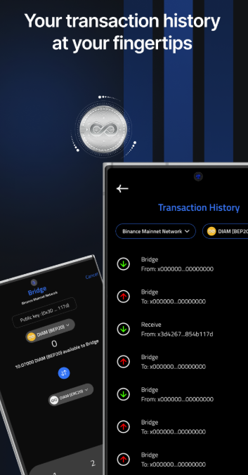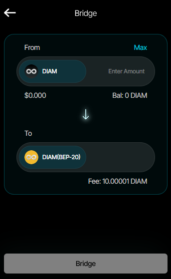 Никаких дополнительных и особенных возможностей криптокошелек «Диам» не предлагает. Единственная возможность — хранить поддерживаемые токены и отправлять их адресатам. Можно переводить монеты между двумя блокчейнами. Для этого необходимо нажать на «Bridge» в главном меню, указать тип цепочки и сумму.
