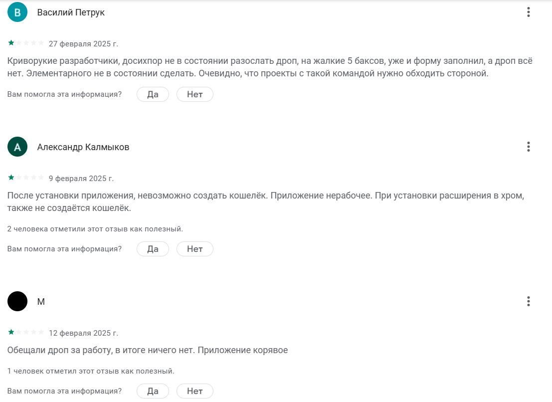 В отзывах о Diam Wallet пользователи не предъявляют претензий к возможностям воллета. Некоторые без проблем используют сервис для хранения и переводов цифровых активов. Жалобы в последних комментариях связаны с тем, что разработчики не выдают обещанные аирдропы и бонусы всего в несколько долларов. Причем таких жалоб десятки.
