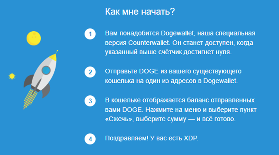 На сайте представлена инструкция, позволяющая узнать, что нужно делать клиентам, чтобы пользоваться услугами сервиса, связанного с криптовалютами. Основатели написали в алгоритме, что сначала нужно перейти в другой свой кошелек и перечислить с него Doge. После этого средства нужно направить на сжигание через DogeParty Wallet, чтобы получить на баланс счета XDP. Инструкция рассказывает, как начать, но по факту ничего не говорит о создании аккаунта.