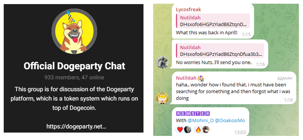 У проекта есть чат в Телеграмм, в котором пользователи общаются друг с другом и с представителями сервиса, обмениваясь опытом. В октябре 2025 года в сообществе состоит более 930 пользователей, часть из которых не стесняются проявлять активность. Аудитория чата представлена англоязычными пользователями, которые не пишут положительных или отрицательных отзывов о DogeParty Wallet.
