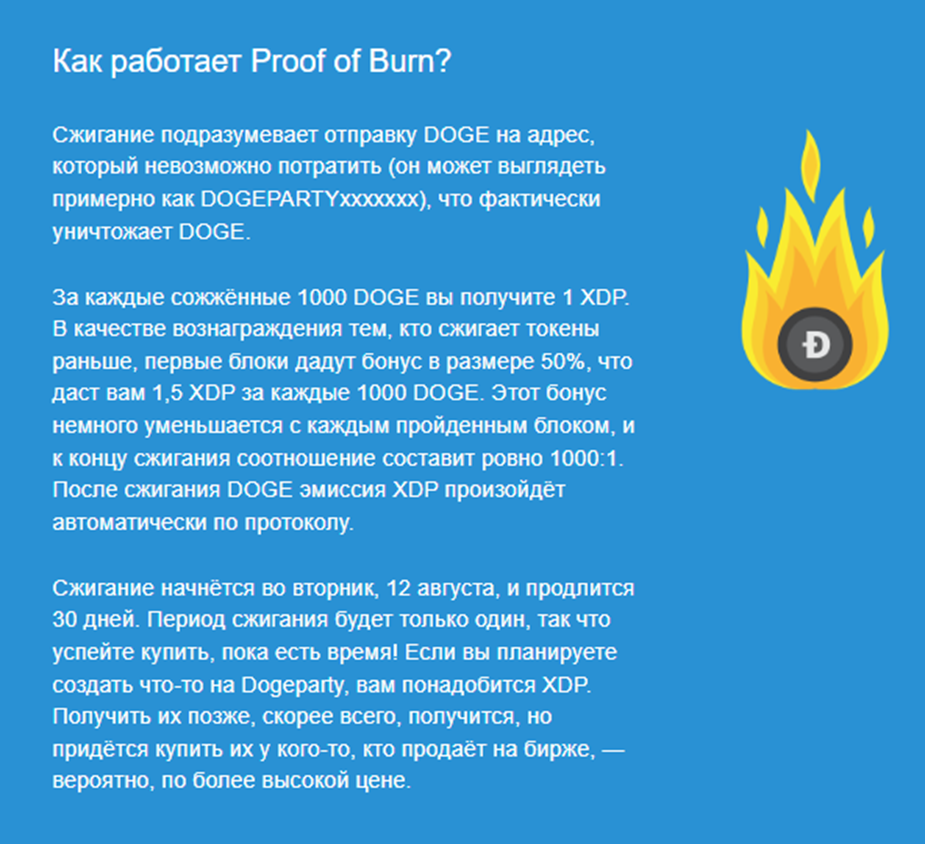 В данном проекте реализуется механизм PoB. Его суть состоит в сжигании токенов, то есть в отправке на адрес, через который их невозможно потратить. За каждые 1 000 сожженных активов Doge клиентам начисляется 1 XDP. Первым пользователям, приступившим к сжиганию, в DogeParty Wallet платят еще 50% сверху в качестве вознаграждения. Последний период сжигания в 2025 году состоялся в августе и длился месяц.