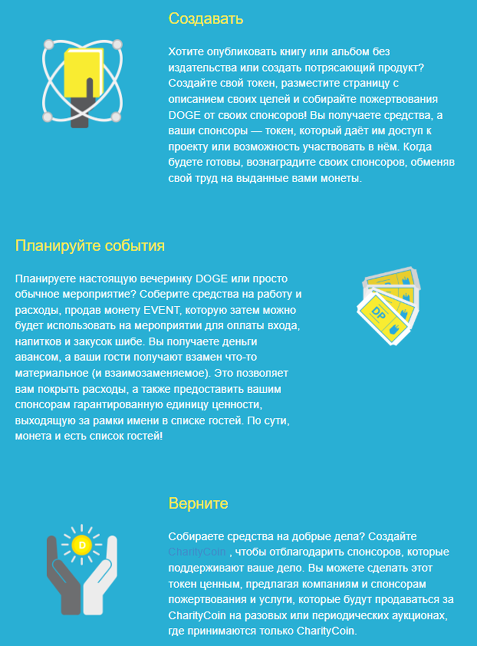 «ДогеПати» создан для работы с криптой и стимулирования деятельности креативных авторов. DogeParty Wallet позволяет продвигать продажи собственных продуктов за счет создания своих токенов и сборов пожертвований. Взамен клиенту начисляют средства, а спонсорам – токены для участия в проекте. Площадка занимается благотворительностью и поддерживает людей, кто готов жертвовать свои личные средства на благие дела.