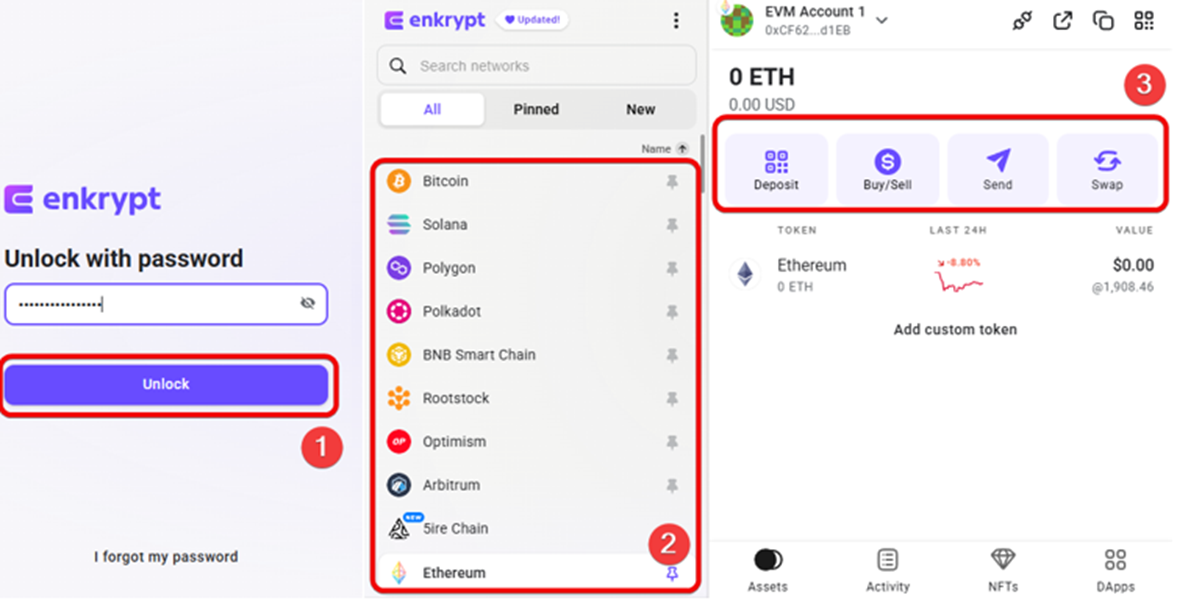 Чтобы начать работать с приложением, достаточно нажать на иконку, указать пароль и разблокировать функционал. Интерфейс очень простой, интуитивно понятный. Список токенов отображается слева, внизу есть отдельная вкладка с NFT, Assets, DApps. Справа находится панель с основными функциями – продажа, покупка, обмен и другие.