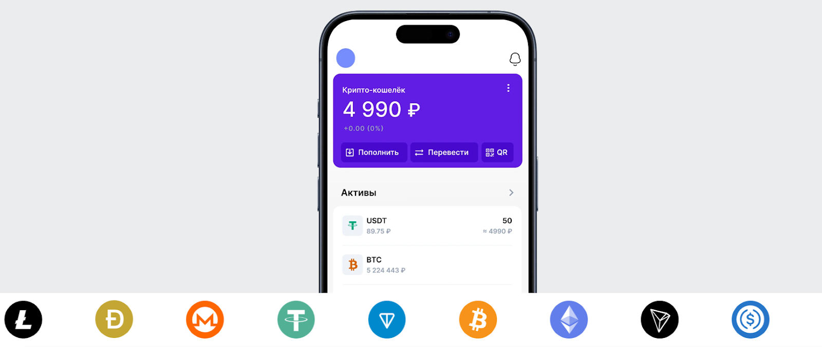 - Bitcoin, Ethereum, Litecoin, Monero, Dogecoin, Toncoin, Tron.