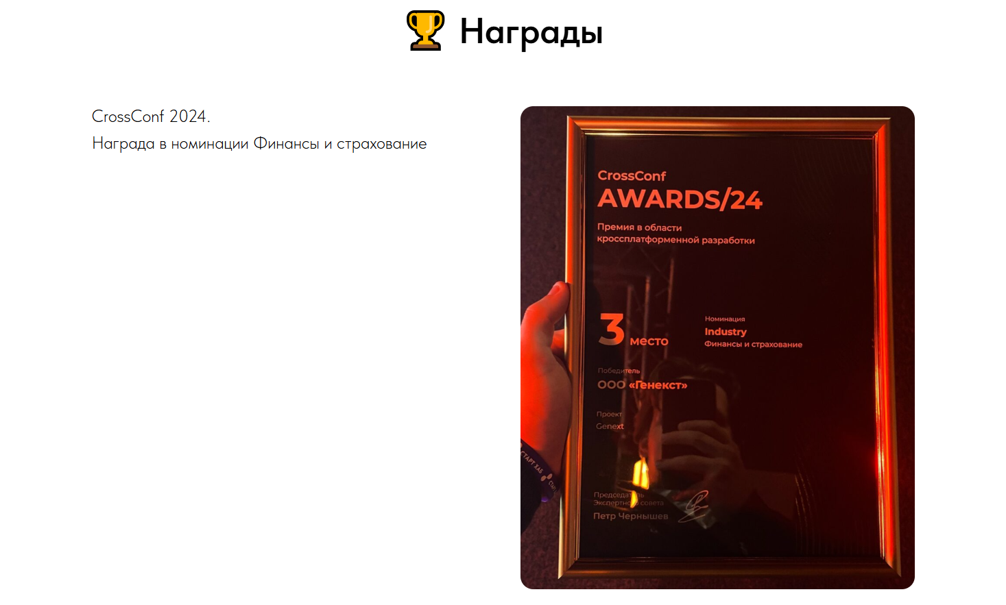Также на площадке заявлено участие в премиях и награды, а именно «Дженекст Воллет» лауреат CrossConf Awards 2024 в номинации «Финансы и страхование».