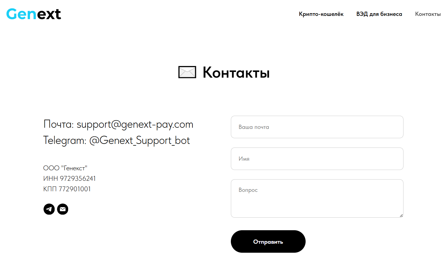 - Ориентация на СНГ и русскоязычных пользователей – проект полностью на русском языке, с понятным интерфейсом и поддержкой через Телеграмм @genext_support_bot и email – support@genext-pay com.