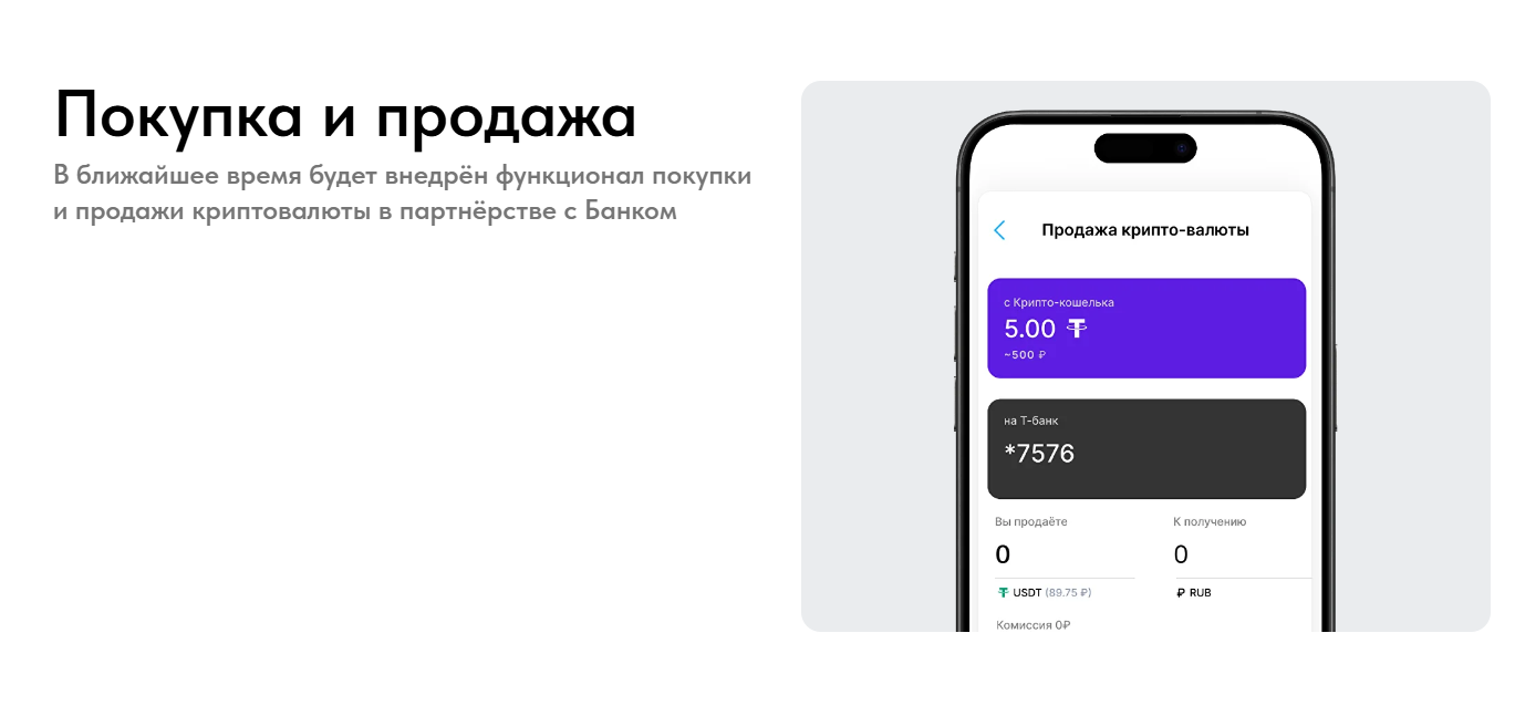 Возможность пополнить счет кошелька через банковскую карту, т оесть купить крипту за фиат, еще в разработке, анонсируется запуск лишь во второй половине 2025 года.