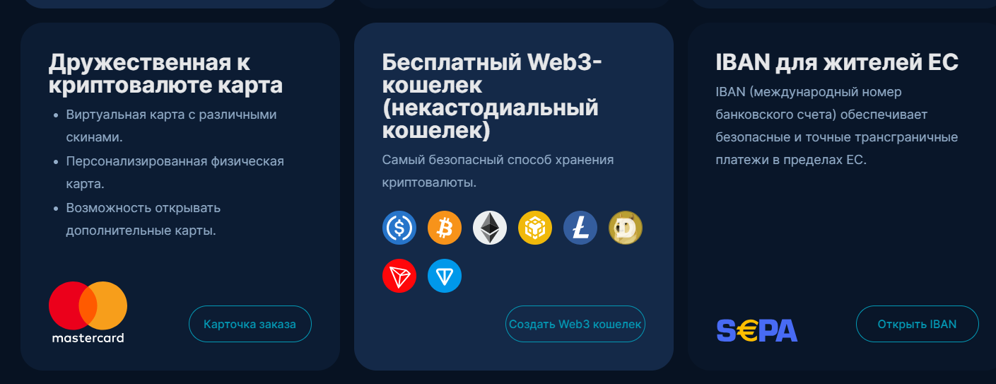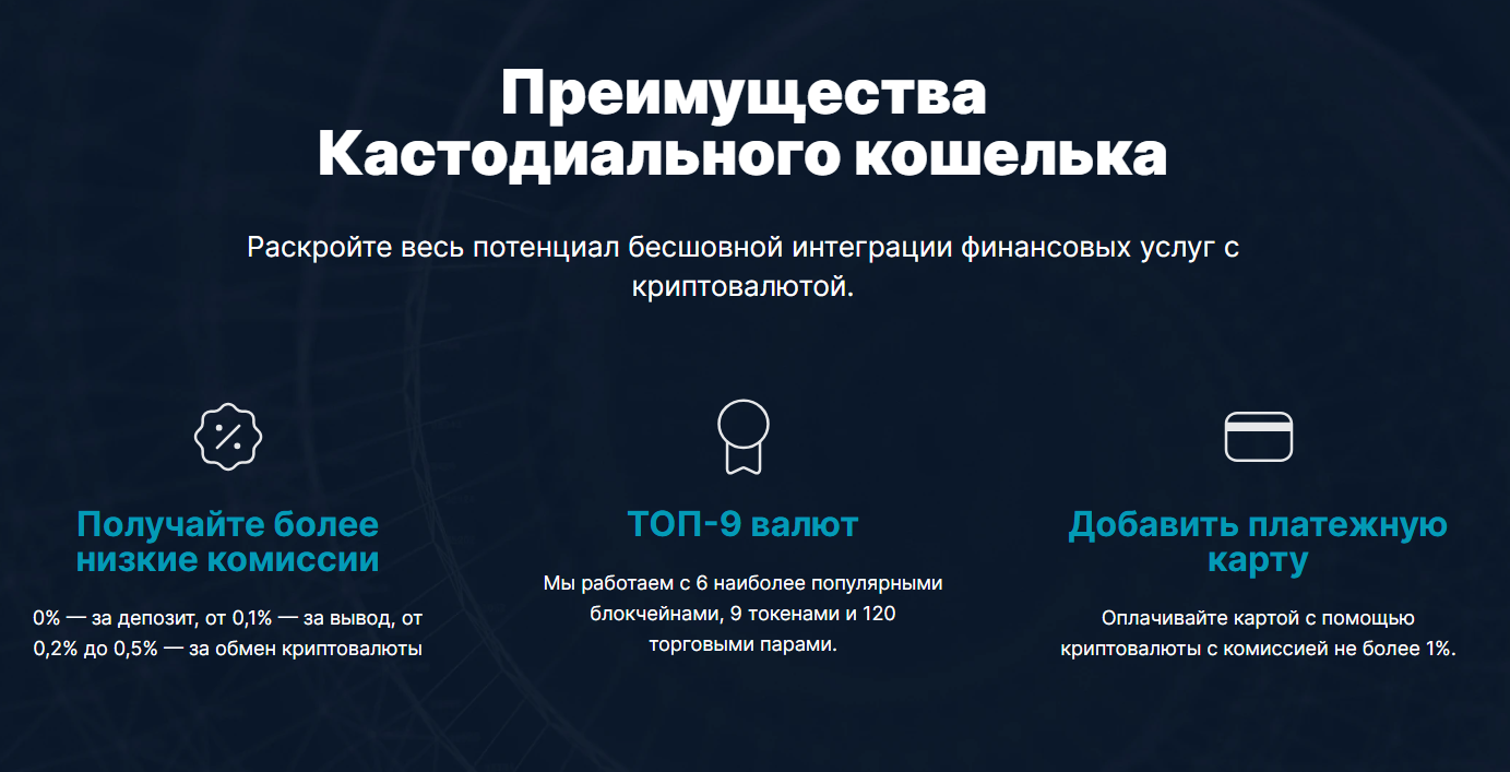 У платформы есть кошельки двух типов 一 некастодиальный, предназначенный преимущественно для хранения криптовалют, а также централизованный (кастодиальный), который ориентирован на торговлю и обмен.