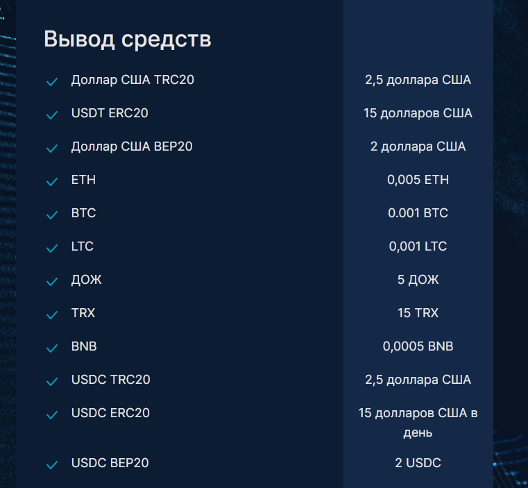 - Вывод 一 0,1% (также действуют минимальные лимиты на вывод по некоторым валютам и токенам);