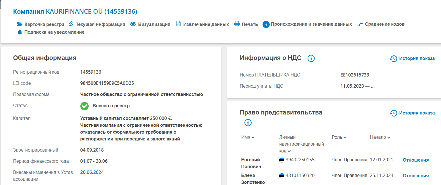 Хотя на самом деле документы имеются. Это наша редакция выяснила, проверив компанию KAURIFINANCE OU, которая действительно обнаружилась в реестре.
