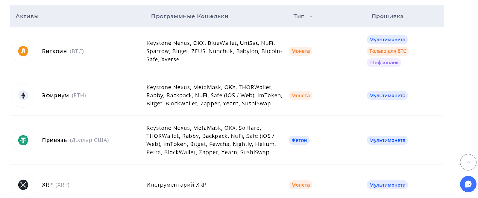 Поддерживаемые криптовалюты KeyStone 3 Pro