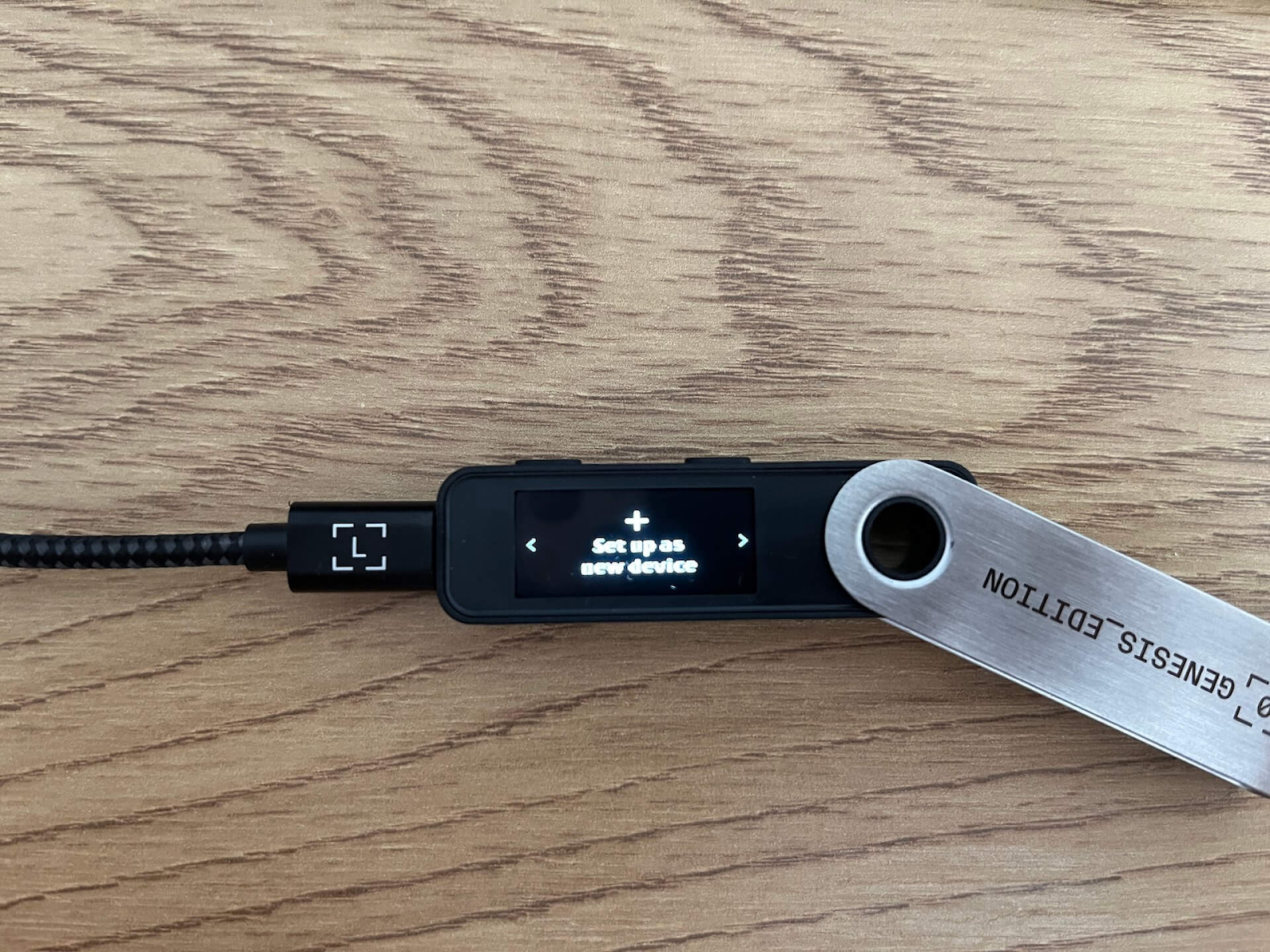 Затем потребуется выбрать раздел «Настроить как новое устройство» на самом аппаратном кошельке. Переключаться между вкладками можно с помощью кнопок на верхней части Ledger Nano S Plus. Чтобы подтвердить выбор, зажмите обе кнопки одновременно.