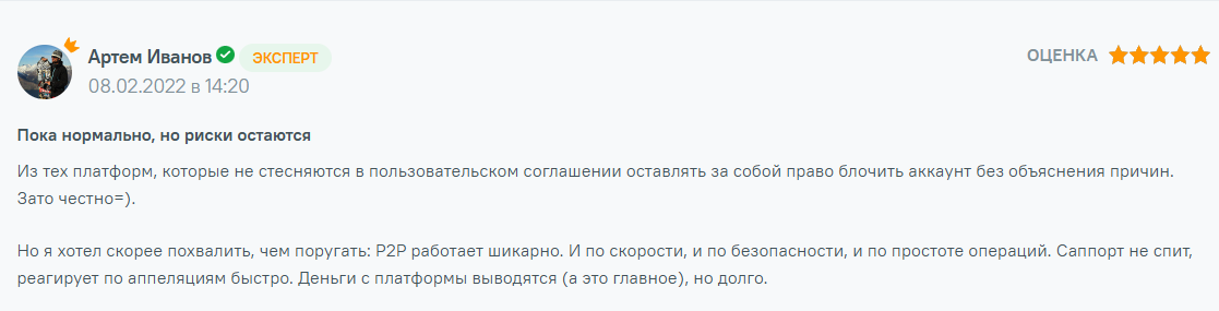 В еще одном положительном отзыве пользователь указывает на быстрый и удобный обмен. Клиент утверждает, что ни разу не сталкивался с мошенничеством на этой площадке.