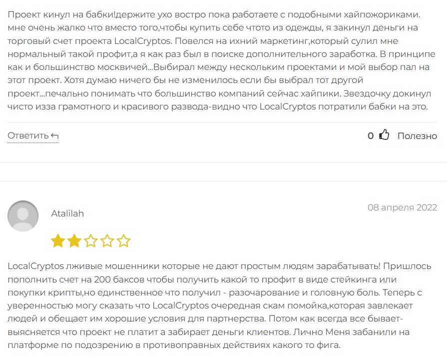 В отрицательных отзывах люди уверяют, что основатели компании Local Cryptos обманули их на деньги. Клиенты утверждают, что положили деньги на счет в этой организации и не смогли вывести заработанную прибыль. Одного из инвесторов забанили на проекте, судя по его словам.