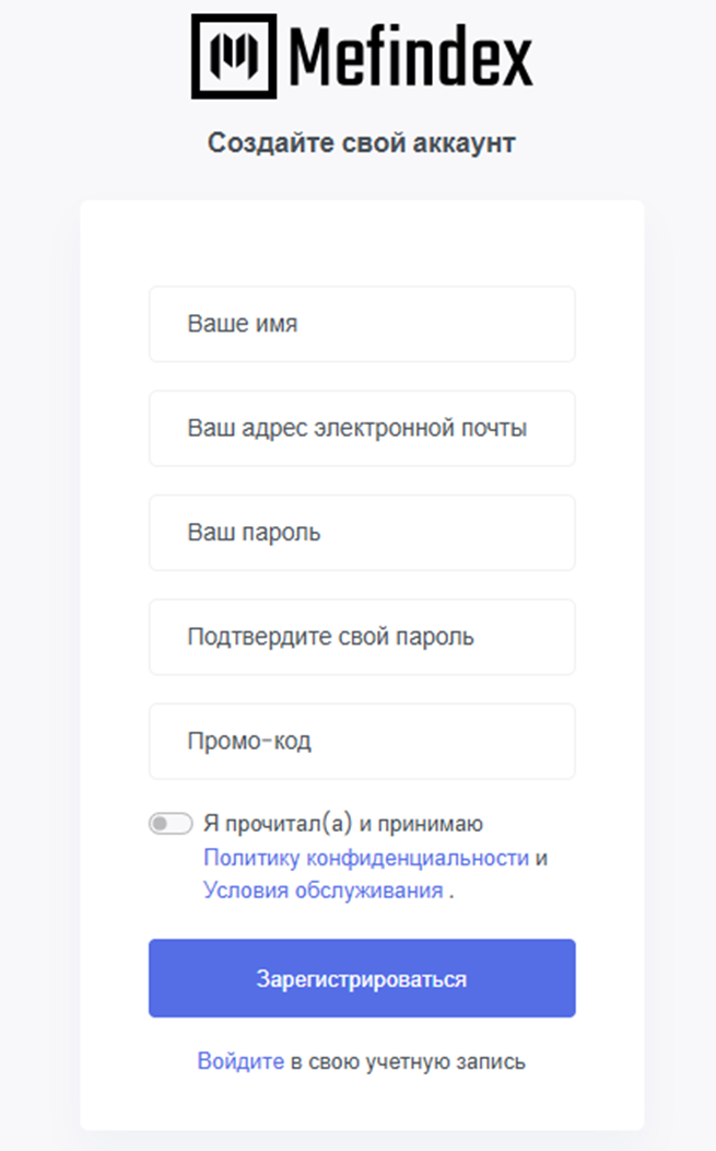 На платформе нет информации о том, нужна ли пользователям верификация для проведения операций. Неизвестно, какие документы требуется предоставлять менеджерам MefIndex com в случае необходимости прохождения проверок личности и сколько занимает процедура. Настройки рабочего пространства становятся доступными тоже только после регистрации, но какие именно есть там параметры, могут узнать только те, у кого есть промо-код.