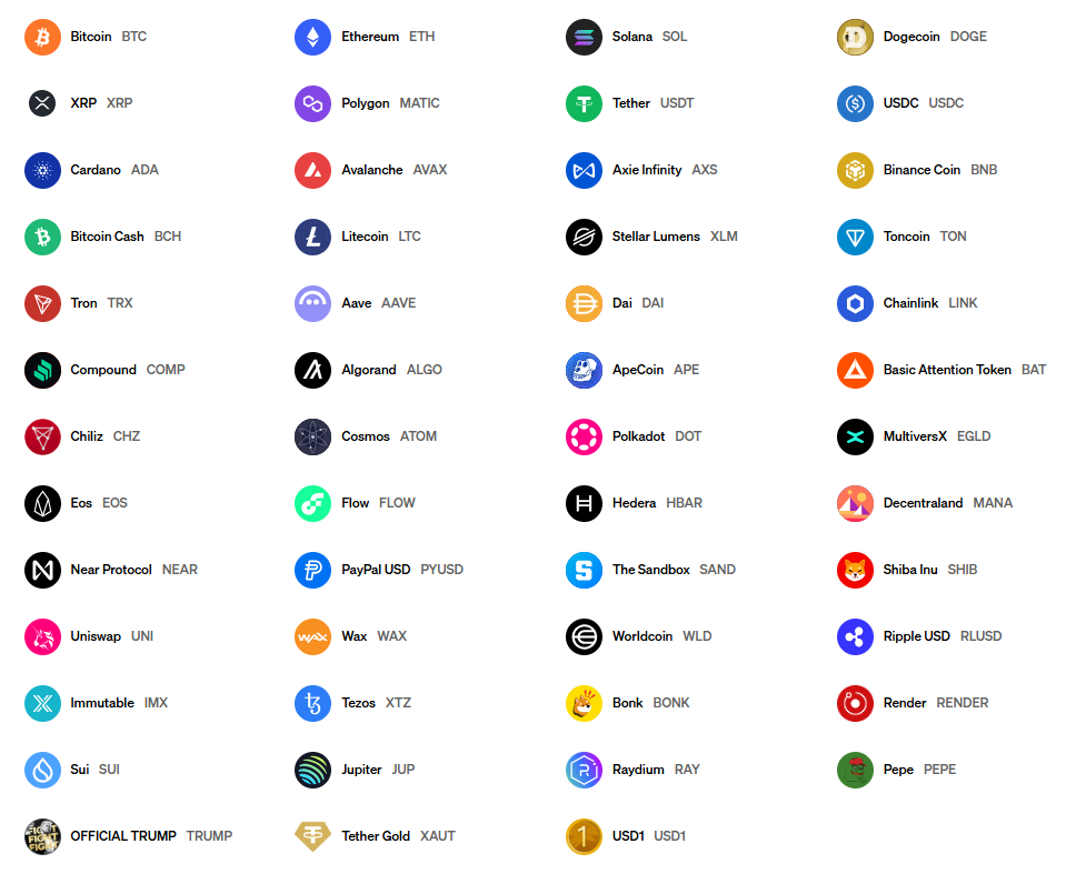 Поддерживаемые криптовалюты MoonPay